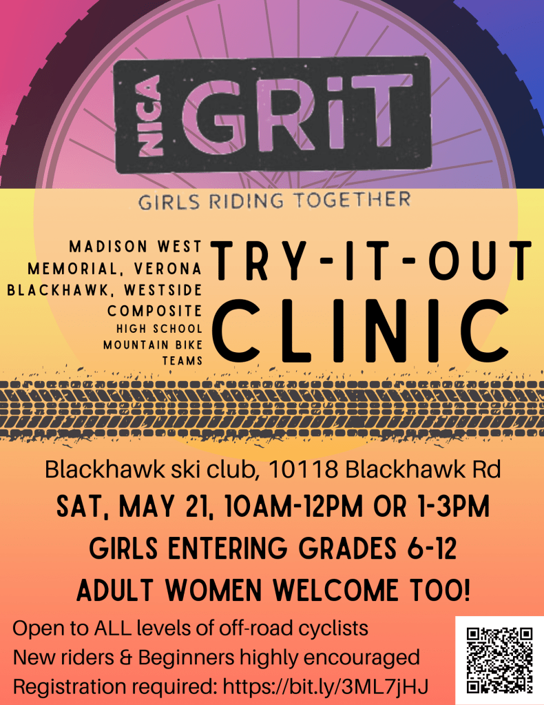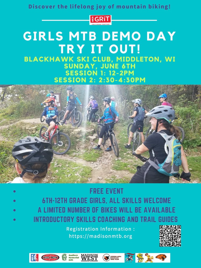 Sunday, June 6 was our second annual Try-it-Out Event for our GRiT/NICA program. It was an AMAZING day! We had over 50 girls participating. We ran 2 sessions that included learning basic skills, riding Roller Coaster and Twist and Shout, and a fun raffle. Thank you to Blackhawk for all their support and for opening their trails to us! Shout out to Erik’s, Machinery Row, Budget, West Madison MTB Team, and Coach Mindy for providing raffle prizes! And shout out to Dreambikes and Matt Martinez for bringing his fleet of rental bikes for us to loan out to girls who needed a bike! HUGE power clap to Coach Kristin for her awesome organizational skills, her outreach, and most of all her energy for making this event happen! Thank you, Kristin!! Tons of coach help made this day successful: Thanks to Coach Stella, Coach Nikki, Coach Nancy, Coach Michelle, Coach Melissa, Coach Grace, Coach Brooke, Coach Mindy, Coach BJ, Coach Heidi, and Coach Patty. Thanks also to our inspiring riders who make all the difference: Opal, Sarah, Maddie W, Maddie S, Emily, Lily, Anja, and Tess. YOU GIRLS ROCK!! Here’s a link to the coverage from Channel 3 News: ‘GRiT’ event gives Dane County girls a chance to learn mountain biking skills.